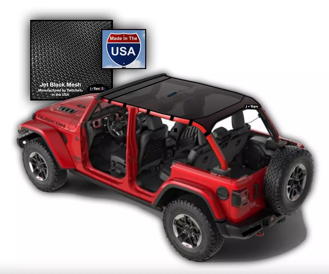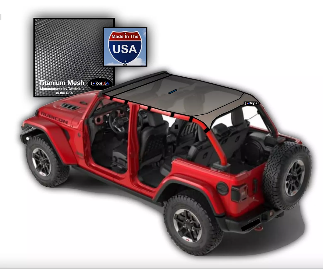 Full Coverage Mesh Sunshade: Conforms to the roll cage's curvature. Provides edge-to-edge and front-to-back coverage. Compatibility: Fits under both hard and soft tops without needing removal. Just flip back the front 2 inches to gain access to the front latches. Designed for 2018-2023 Jeep Wrangler JLU 4 door models. Not compatible with MOPAR grab handles or One Touch Power Top. This product is not tested or designed around any other aftermarket tops or accessories Innovative Mounting System: Neodymium magnets hold the top in place - front and center. No special tools, clips, or nubs required for installation. Patented Nylon front neodymium magnetic strip slips into the windshield so there is no gap to let in sun and wind. Windshield mount tested up to 90MPH Durability and Protection: Made from Twitchell® US Manufactured PVC Coated Nylon Mesh. Blocks 80-90% of UV rays. Includes ½ aluminum front/rear integrated support rods. Features three layers of perimeter UV webbing. Convenience: Simple installation with military-grade buckle and heavy-duty webbing system. No gaps to let in sun and wind. No-Bungee installation with Neoprene-padded buckles and TriGlide strap adjusters. Water Resistance: Mesh material is not waterproof, it is not designed to be however testing shows deflection of some water at speed. Warranty: 1 year warranty covering manufacturing defects. Summary