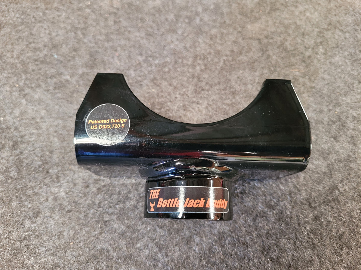 A bottle jack is said to be one of the safest ways to jack up your vehicle. This nifty little axle saddle fits right on your hydraulic bottle jack and holds your axle tube while you jack up the axle. This product has a patented design for lifting an axle with a bottle jack. It just slips on and doesn't require any welding! This is the perfect automotive tool to keep in your vehicle when using a bottle jack on an axle. This bottle jack axle bracket will help lift a vehicle from the axle more securely rather than putting just the bottle jack pad on the axle. Will hug and cradle axles up to 3 inch tubes. As you can see in the pictures, the design is compact and lightweight; it only weighs 1 pound 9 ounces! The saddle is made from 1/4" steel and the assembly sits on any bottle jack that has a 1.5" lifting platform or smaller. It will likely work with any 12 ton bottle jack but measure your lifting platform to confirm. Smaller bottle jack lifting pads will work, but there will be space between the jack and the tube and it will have to be centered, it's ideal to have the lifting pad as close to 1.5 inches in diameter as possible for a better fit. It's the perfect bottle jack adapter for the garage, the 4x4 trail, Jeep, Recovery, RV, travel trailer, farm, ranch, horse or livestock trailer, vehicle roadside safety kit, or any other location where you want to lift the vehicle from a solid axle in a secure and safe manner. Comes powder-coated in black. Made in the USA. Bottle jack not included